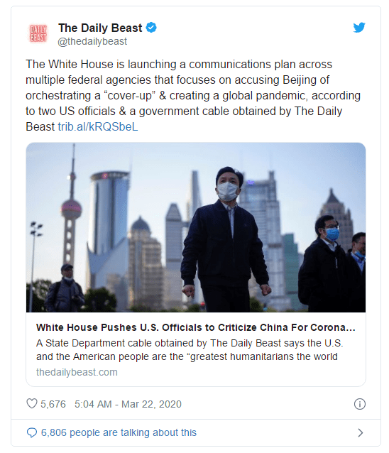 Back in 2016 it was harder for people to see this escalation on the horizon, but now in the wake of the COVID-19 pandemic we’re hearing a frantic, disproportionate amount of anti-China sentiment from the Trump administration and its supporters, in the same way we heard Russia hysteria amplified over the last three years by Trump’s enemies. Trump was politically pressured to dangerously escalate cold war tensions with Russia, and he’s now being politically incentivized to pass the blame for his administration’s spectacular failures in addressing this pandemic on to the Chinese government in a way which manufactures support for escalations on that front as well. Two different narratives, same agenda.