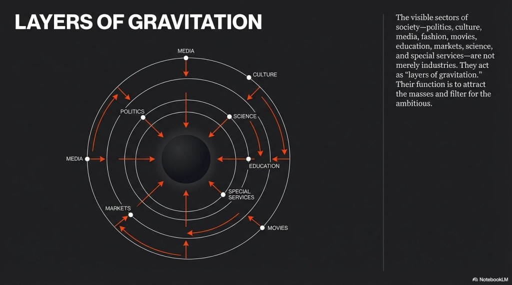 The stability of the Epstein-Centric core is maintained by a series of “gravitational layers.” These layers act as a dual-action mechanism. They provide the necessary “attraction of the masses” to sustain the system’s legitimacy and energy. Simultaneously, they filter and accelerate high-performing individuals toward the center. These circles are not independent entities but are interconnected components of a single, unified gravitational field.