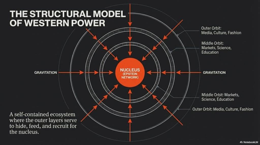 The “Epstein-Centric” thesis posits that the Epstein network is not a peripheral anomaly. It is not a tangential scandal; rather, it is the fundamental core. This makes it the very nucleus of the Western power structure. This model argues that the architecture of the collective West is organized around this center, with every major social pillar acting as a “layer of gravitation.” While conventional analysis treats fields such as science, fashion, and politics as independent silos, the gravitational metaphor reveals how these seemingly unrelated paths of high-level success converge upon a shared point of origin and control. Understanding this nucleus is the only way to accurately map the trajectory of the modern elite.